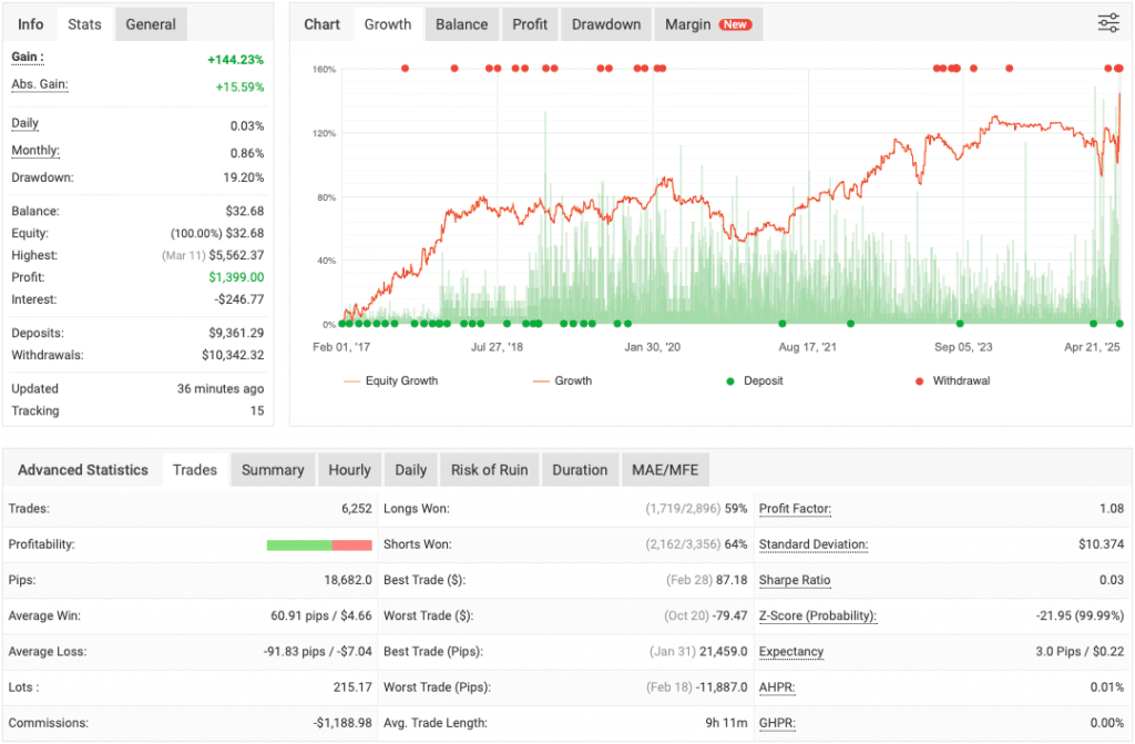 Order execution features also include optional execution delays and the use of take profit, stop-loss, time-stop, and trailing-stop mechanisms. Every trade is protected by a stop loss, and the EA does not rely on conventional grid or martingale hedging systems by default.