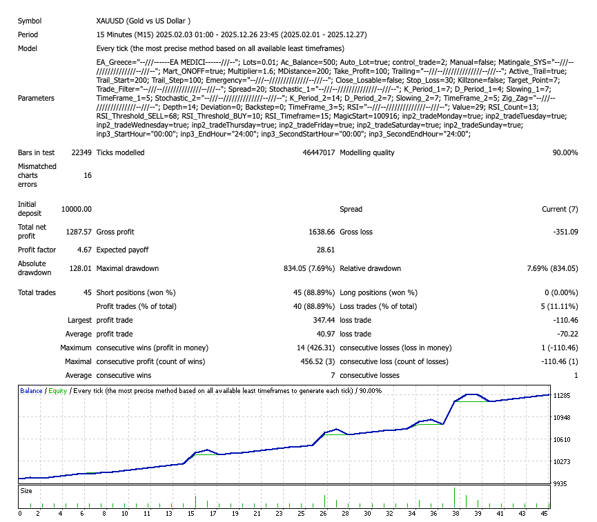 - Analysis: The backtest (covering nearly 11 months) turned a $10,000 deposit into a net profit of $1,287.57.