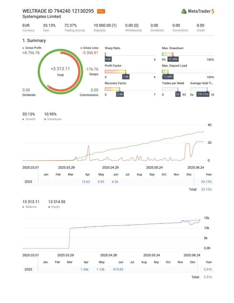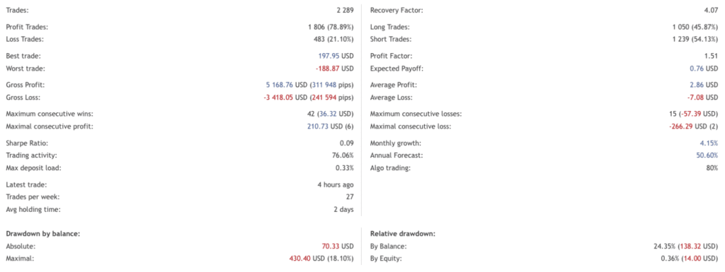 - Stability – The system has been tested under different scenarios, including high volatility and quiet, ranging markets, to check how it performs under stress.