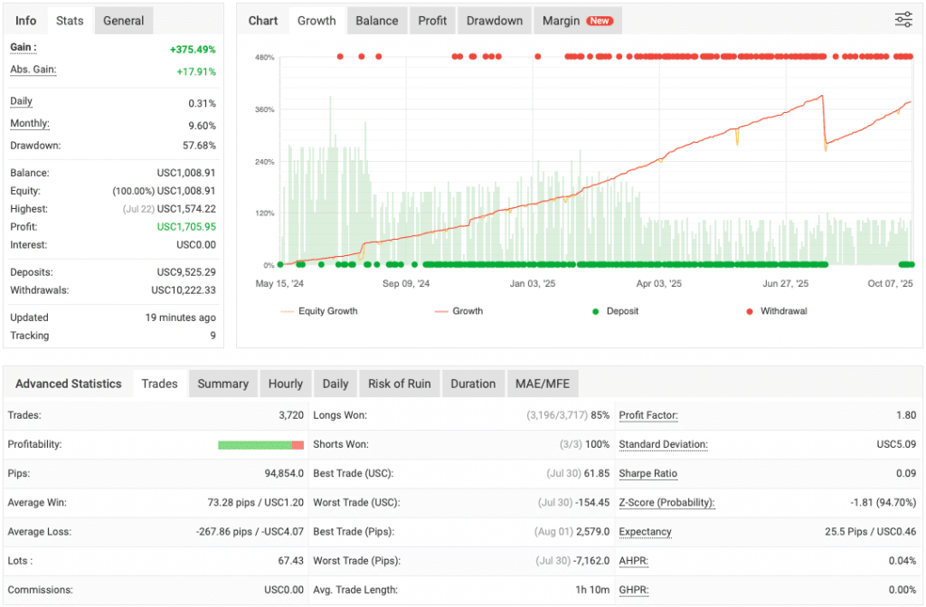 - Trade Duration and Risk – When the grid strategy is triggered, trades may remain open for a longer duration, sometimes hours. This phase increases exposure to market volatility and potential drawdown, especially if the market trends sharply in the opposite direction.